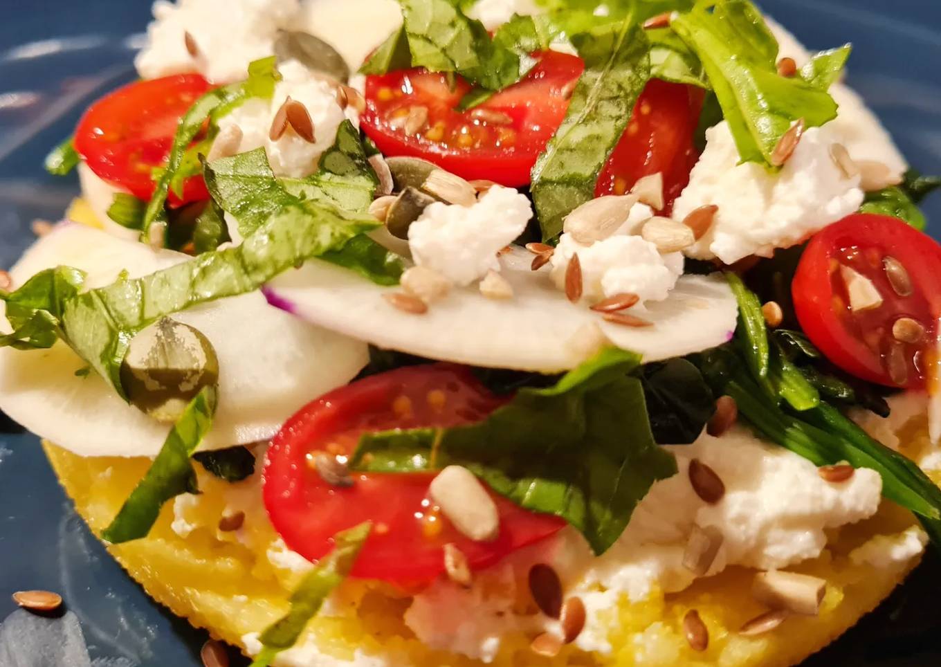 - Garniture au choix (ici ricotta, tomates, épinards, graines)