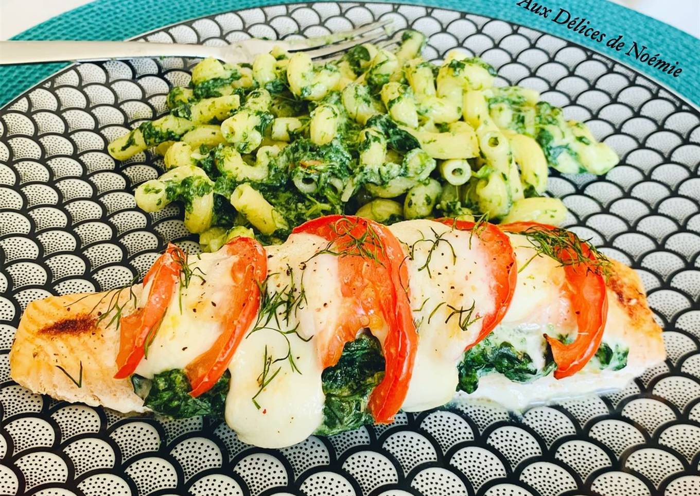 - Inciser les pavés de saumon dans l’épaisseur sans les ouvrir entièrement. Garnir avec des épinards. Disposer sur le dessus des demi rondelle de tomates et des morceaux de mozzarella fior di latte, ajouter de l’aneth. Enfourner à 180° pendant 15/20 min. Tout dépend de la taille de vos pavés