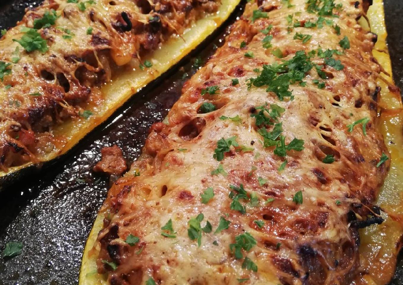 - Réunir les morceaux de courgettes et la viande. Garnir les courgettes avec cette préparation et ajouter du gruyère, mettre au four 25 mins a 200 degrés