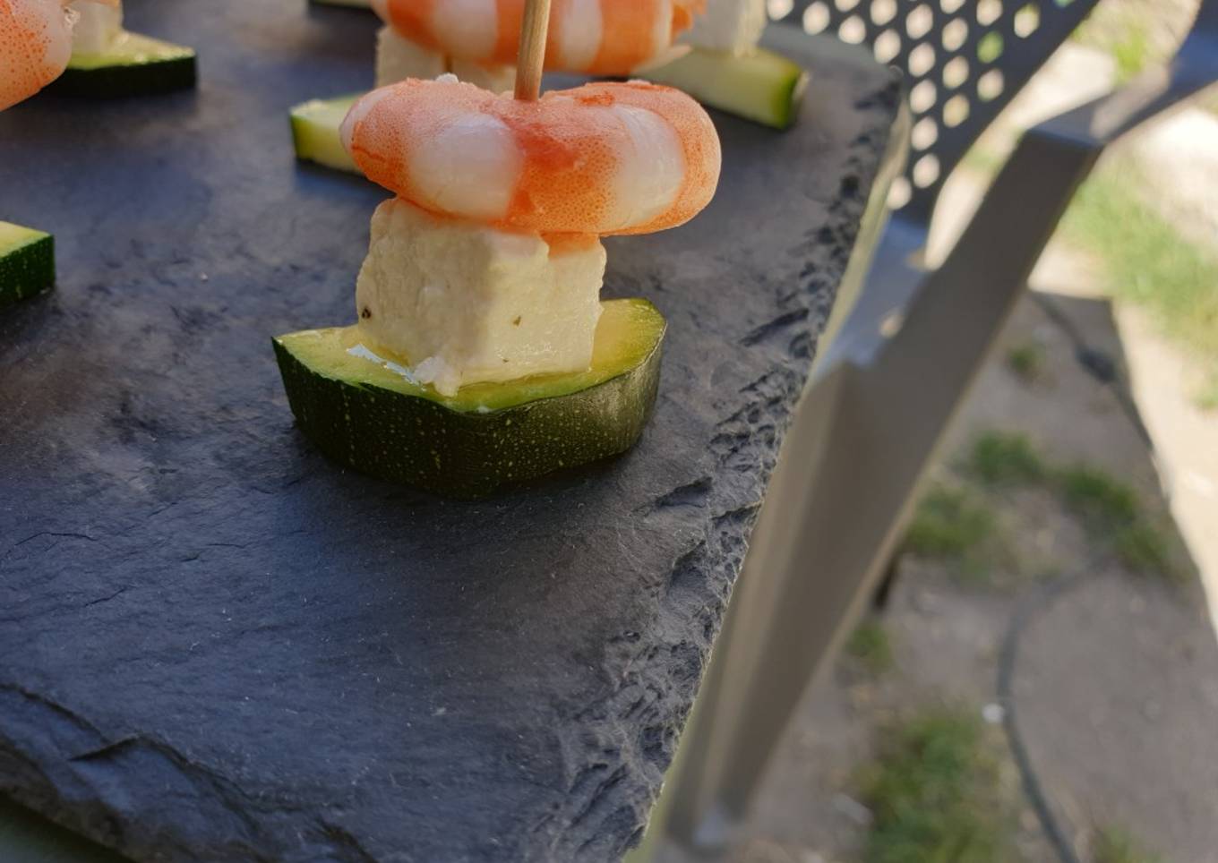 - Avec un cure dent mettre une crevette un morceau de feta et finir avec une demi tranche de courgette
