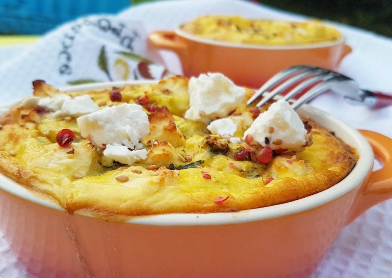 - Dans un plat ou des ramequins individuels, versez la préparation. Ajoutez par dessus le reste de la feta. Enfournez 25 à 30 minutes (adaptez en fonction de la taille de votre plat)