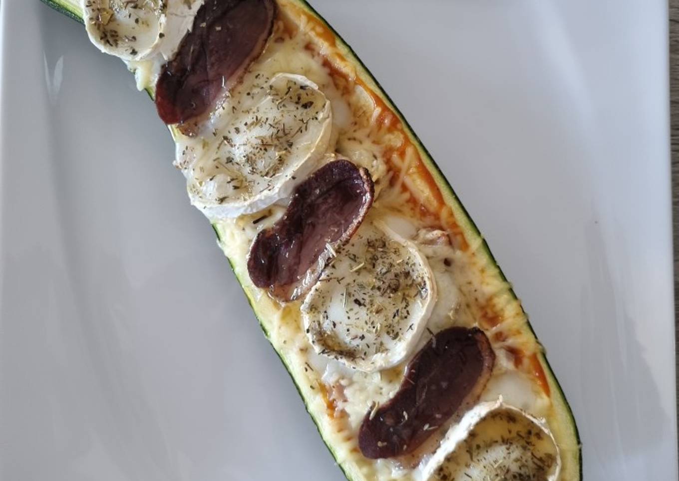 - Une fois sorti du four mettez la sauce Barbecue dans le fond de la courgettes puis les émincé de Poulet,Emmental rapper, couper des tranches de chèvre Puis la disposés sur la courgette et mettre entre les rondelles de chèvre le magret séché et parsemer les morceaux de chèvre d'herbes de provence enfourner de nouveau 10 min c'est prêt à manger à la sorti du four mettez le miel dessus 😋