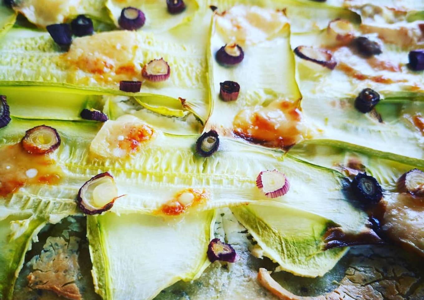 - Laver vos courgettes et les couper en fine tranche dans la longueur (ou prendre une mandoline, éplucheur). Les disposer sur toute la pâte.