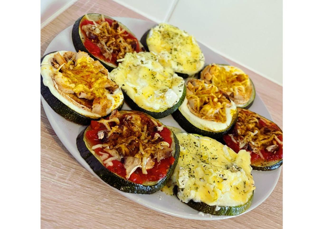 - Garnissez chaque rondelle de courgette (3 : crème fraîche, poulet, champignons, gruyère râpé - 3 : brie, comté, gruyère râpé et épices à pizza - 3 : sauce tomate, gruyère râpé et champignons)